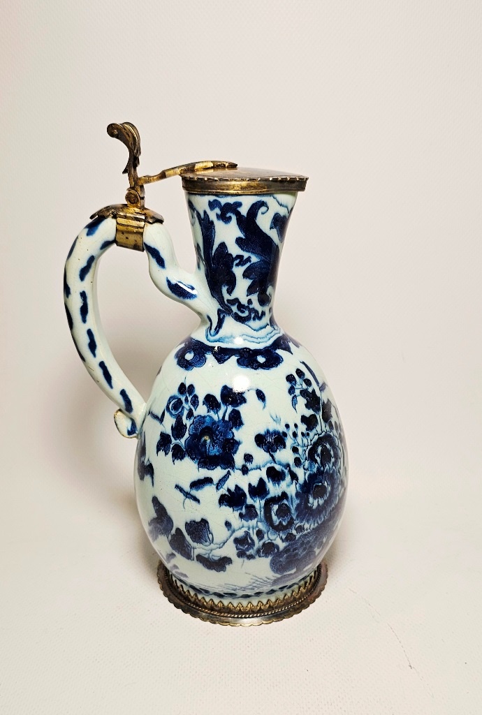 Delftská keramika, ktorá sa vyrábala v Holandsku od 16. storočia. Hrnčiari z Delftu sa silne inšpirovali čínskym porcelánom dovážaným holandskou Východoindickou spoločnosťou a začali vyrábať vlastné kameninové nádoby s cínovou glazúrou zdobené kobaltovo modrou farbou. Niekoľko detailov, ktoré naznačujú holandský pôvod: Modrobiela kvetinová výzdoba v čínskom štýle, veľmi typická pre delftskú keramiku. cínové úchytky, ktoré sa často pridávali v 17. – 18. storočí v Holandsku a Nemecku na ochranu okraja a zvýšenie praktickosti nádoby. Tvar rukoväte a výlevky, ktorý zodpovedá európskym adaptáciám ázijských porcelánových foriem. Tento typ nádoby sa často používal ako džbán na pivo alebo víno, niekedy nazývaný Delftský krígeľ alebo džbán. , výška džbánu je 23cm
