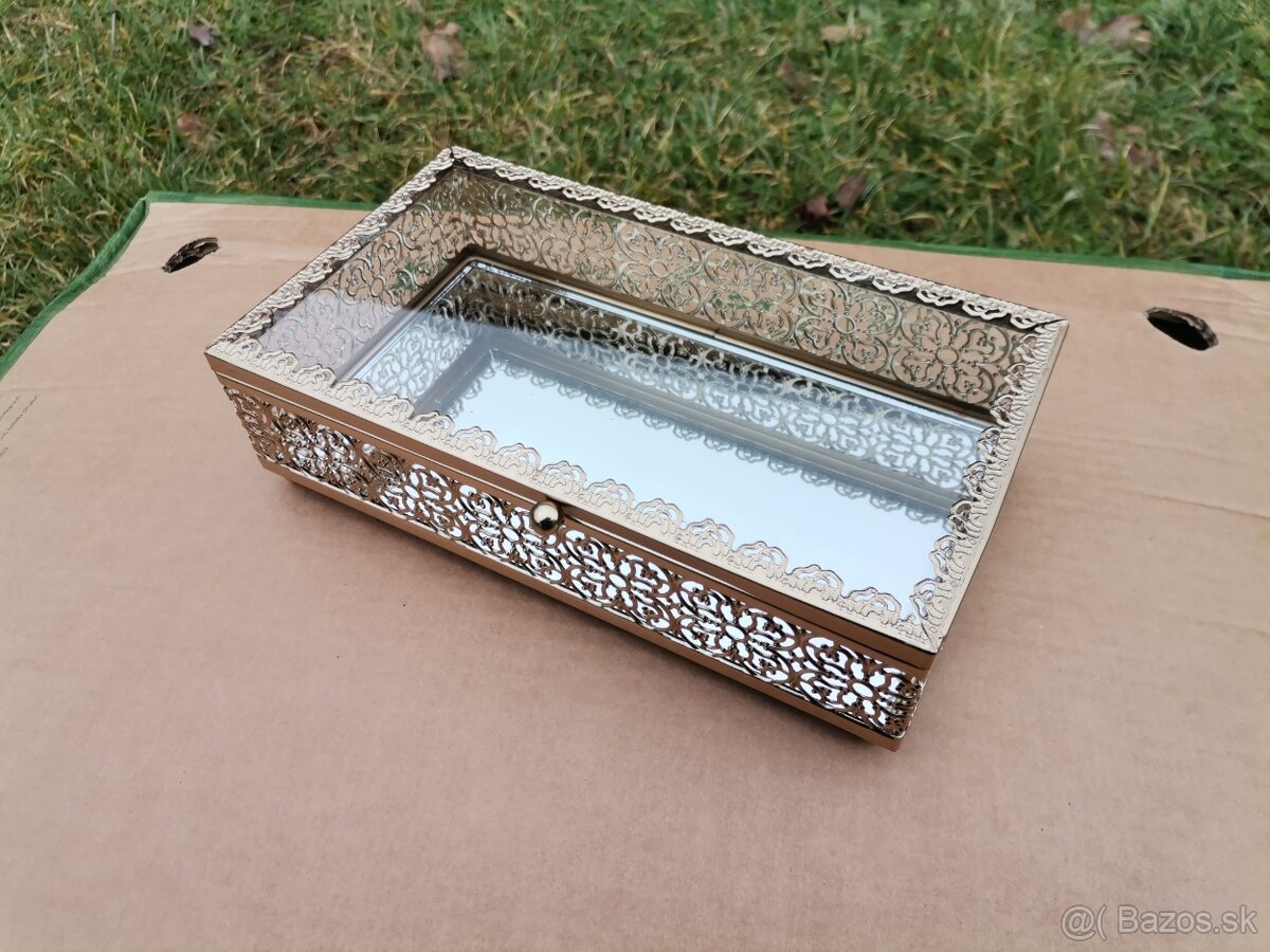 Predám túto zaujímavú kovovú šperkovnicu - vitrínu, materiál je teda železo- kov, z vrchnej časti je sklo, vnútri na spodnej časti je zrkadlo. Šperkovnica je v TOP stave, bez akéhokoľvek poškodenia. Rozmer 24,5cm x 14,5cm x výška 7cm.