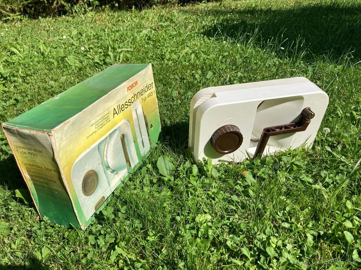 Predám zachovalý ručný krájač FORON nemeckej výroby. Stav a súčasti ako na obrázkoch, plne funkčný, v originálej krabici. Na dobierku neposielam, cena plus poštové (pošta, packeta). Platí do zmazania. Prosím komunikovať emailom, cez "kontaktovať inzerenta". Cena 15.