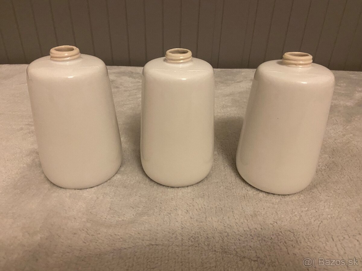 Predám 3 kusy úplne nových keramických váz bielej farby. Rozmery: výška 12,5 cm a priemer 7,5 cm.