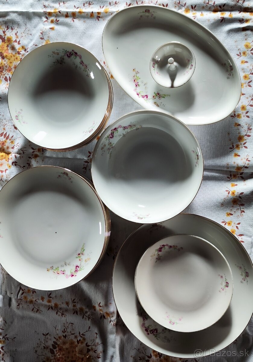 Predám starú obedovú súpravu. Obsahuje už len 6 hlbokých tanierov, 6 veľkých plytkých tanierov, 3 malé dezertné taniere (vidno používanie), 1 kompótovú misu, 1 pečeňový oválny tanier, 1 veľký servírovací tanier, 1 soľnička. Osobný odber.