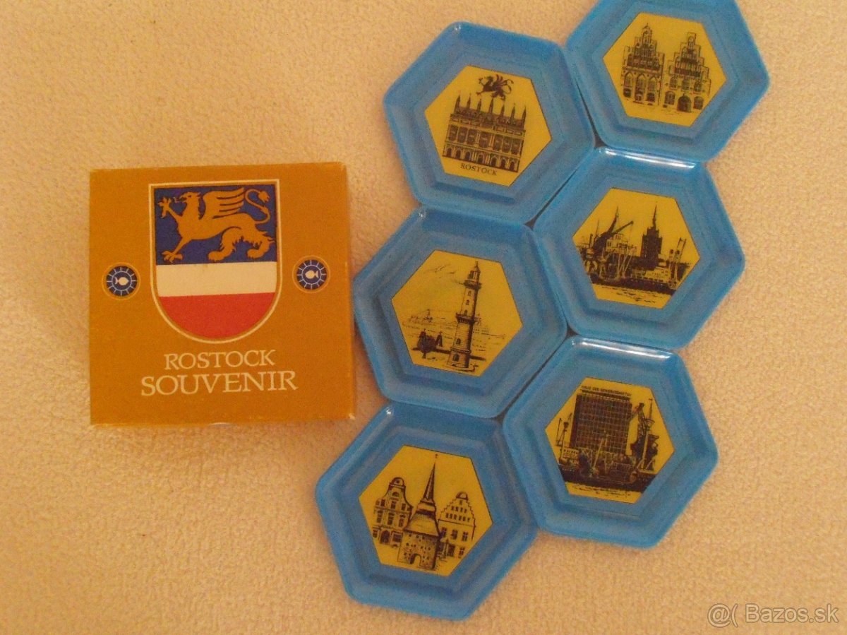 Ponúkam 6 ks tácok pod poháre z UH v originál krabičke - suvenír z nemeckého Rostocku z čias bývalej NDR. Kontakt len mailom, tel. č. neexistuje. Pozri aj ostatné moje inzeráty.