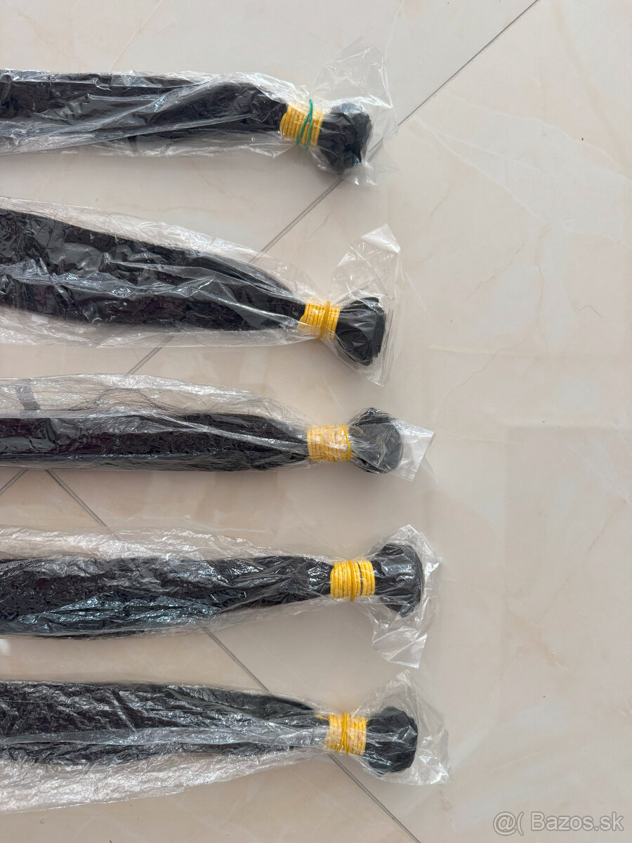 Predam krasne cierne 100% ludske brazilske vlasy. Vlasy su natressovane, uplne nove, zabalene, nepouzite. Dlzka 85-90cm.Vaha spolu 400g / 4 pramene po 100g/ cena za 100g/88€