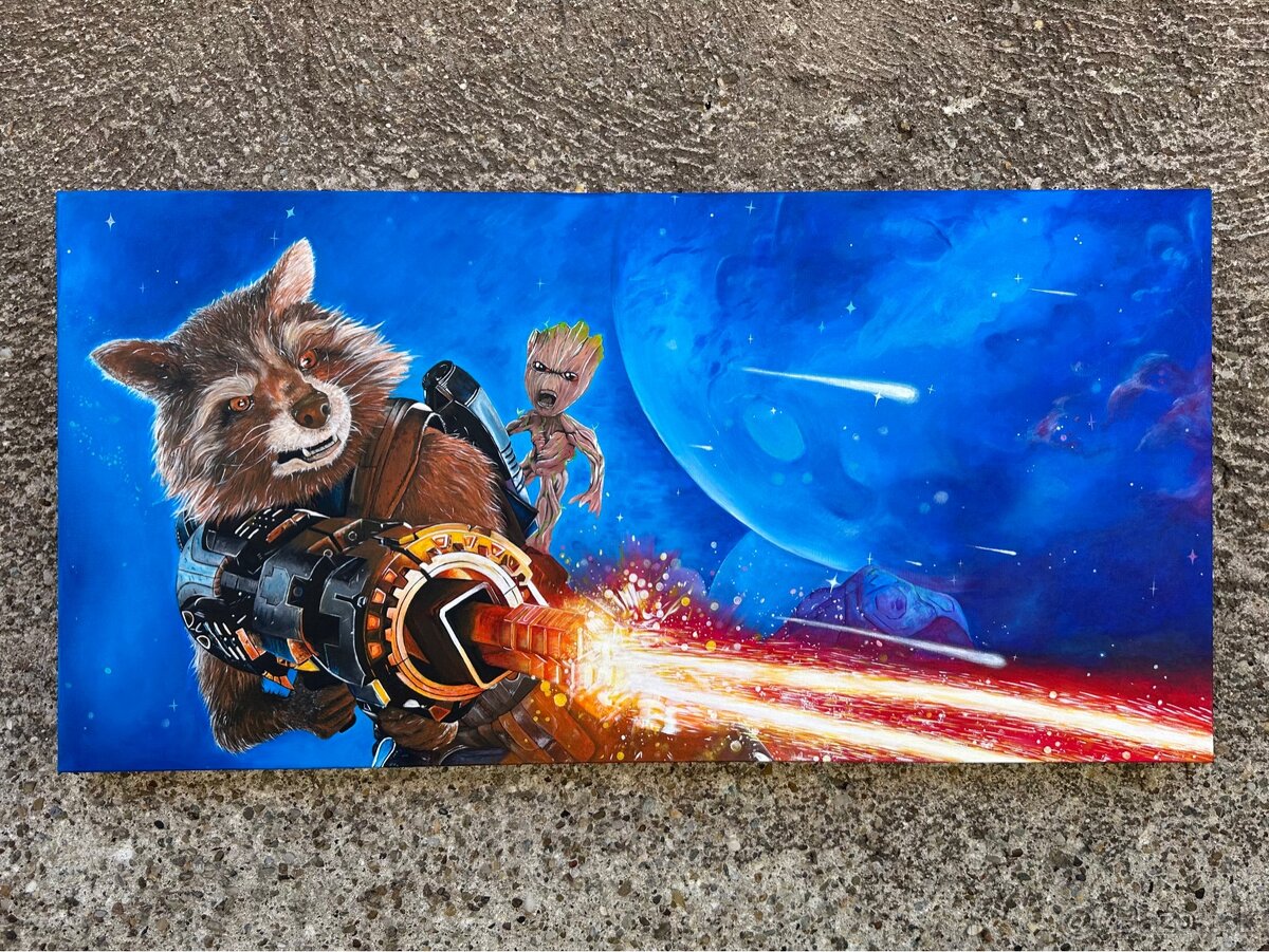 Rucne malovany obraz z filmu strazcovia galaxie (rocket, groot) Akryl na platne 100x70cm, 3D platno, obrazok je vhodny ako darcek pre fanusikov filmov Marvel a zberatelov :) v pripade zaujmu namalujem obrazok podla vasich predstav (vid. Dalsie fotky) viac info poslem v maili. V pripade zaujmu o iny format sa cena meni. Posielam postou, kurier pripade kosice okolie prinesiem. Cena je pevna uz aj s postovnym