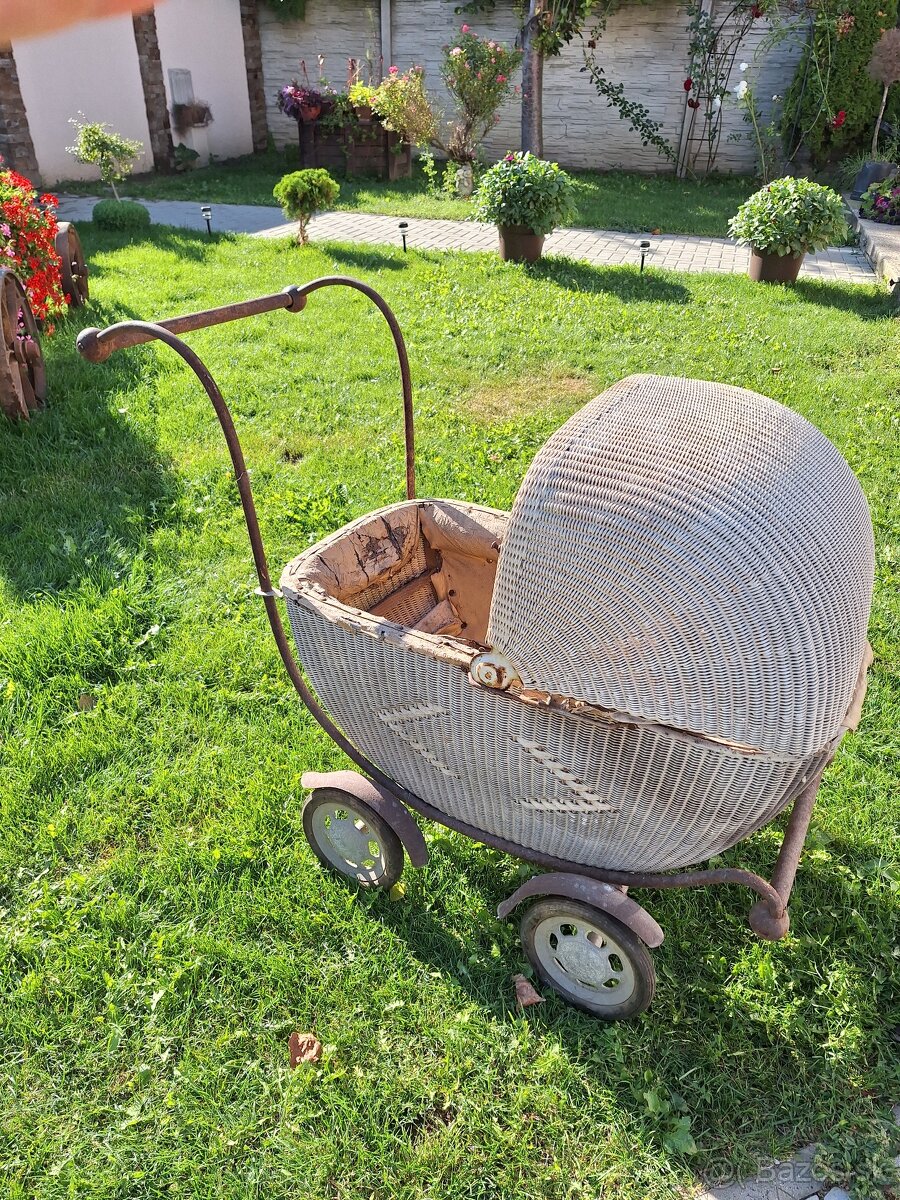 Predám starožitný detský prútený kočík pre bábiky / 50.roky - [27.1. 2026]Ponúkam na predaj originálny starožitný prútený kočík pre bábiky: