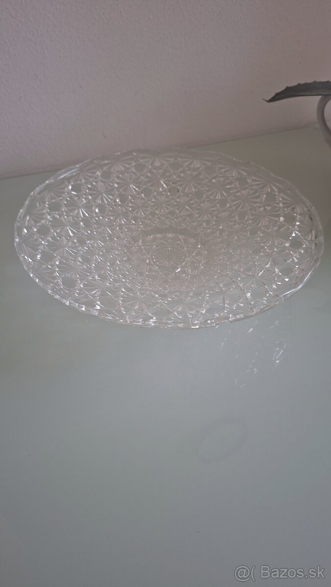 Veľký podnos, číre brúsené sklo,2 pol 20 storočia, bez poškodenia, priemer 32,5 cm.