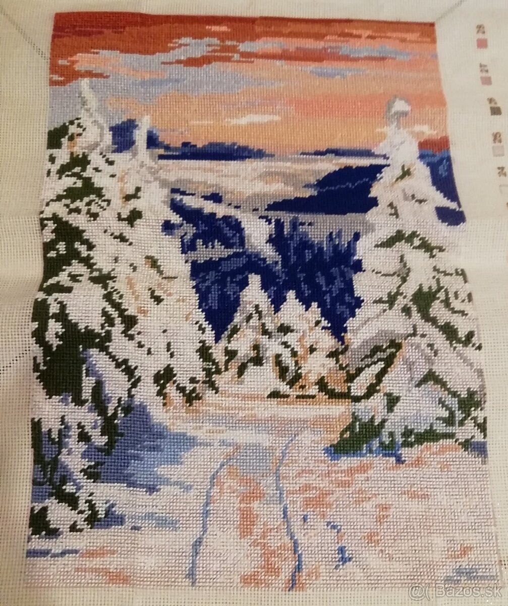 Zima vyšívané bavlnkou 32x45 cm za 32 Eur, sirotky vo váze 24x30 cm za 24 Eur, slnečnice s makom 61x45 cm za 68 Eur, maky s margarétkami 49x61 cm za 70 eur, lekno 35x45 cm za 35 Eur. Všetky sú vyšívane bavlnkami. Obrazy dodávam bez rámu.