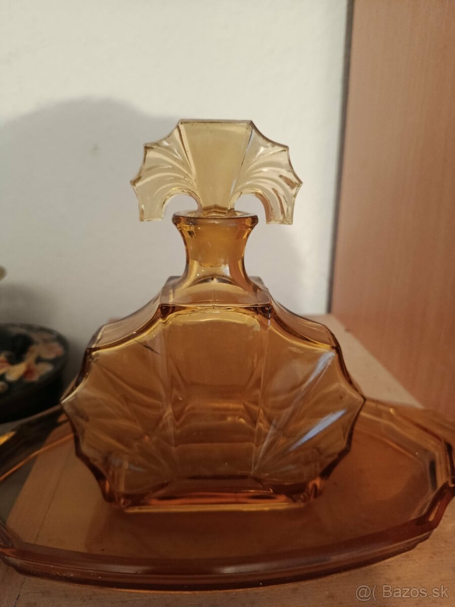 Predám sadu Tácka+karafa- Karafa na fotke vidno prasklinka a na zátke oťuk. Predám za 30,-eur.
