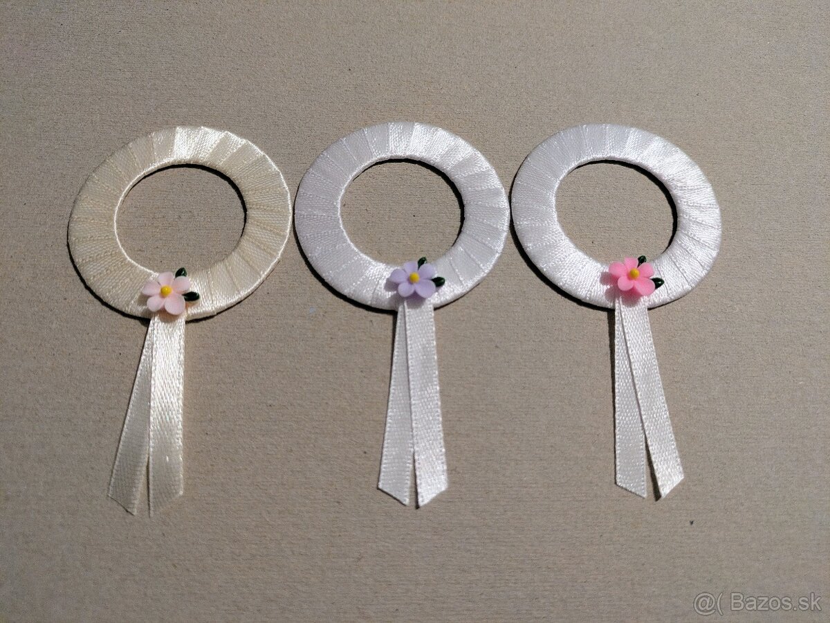 Venčeky sú vyrobené zo saténových stúh, aplikácií a celokovového špendlíka.