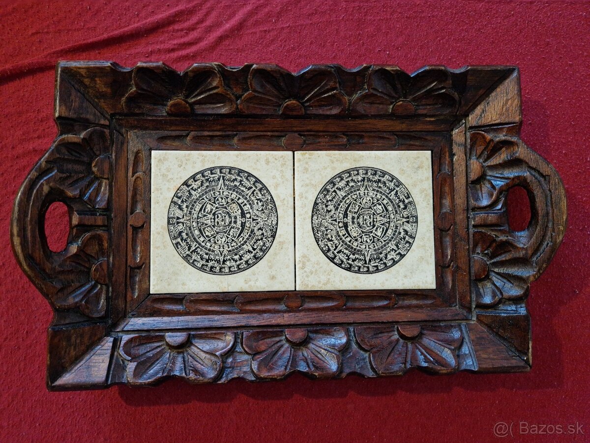 Vyřezávaný dřevěný tácek o rozměru 38x23cm. Vložené 2x kachlik s motivem mayského kalendáře.
