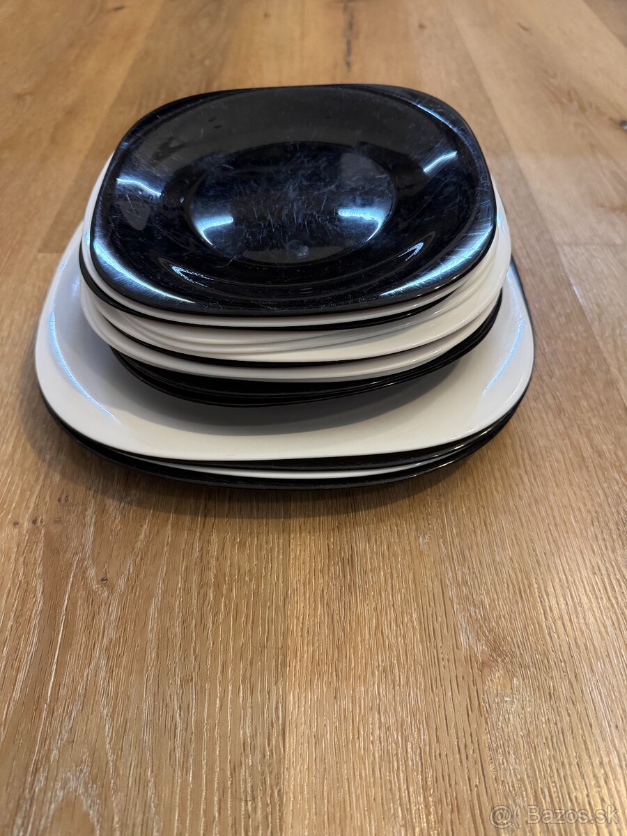 Ponúkam na predaj taniere - rôzne. Farebné červeno-zelené sme dostali ako svadobný dar, použité len raz. Pribalíme aj šálky a kávu aj podšálky. K čierno-bielym - vzor kosoštvorec - pribalíme aj poháre, ostali nám len plytké taniere (viď obrázok). Zvyšné už používané, ale už nepotrebné a nie sú kompletné.