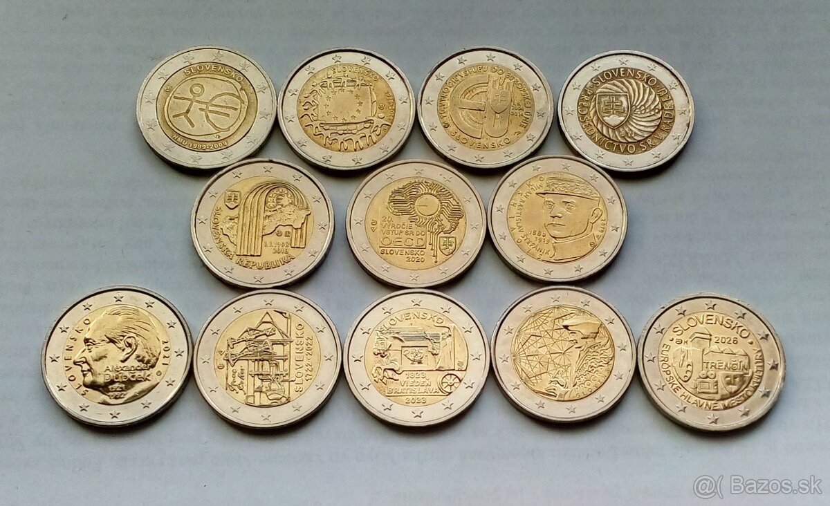 Predám 12 ks slovenských 2 € pamätných mincí za 26 €. Len osobne BN,PE,PD,TR,ZA. Spodný rad sú UNC mince.