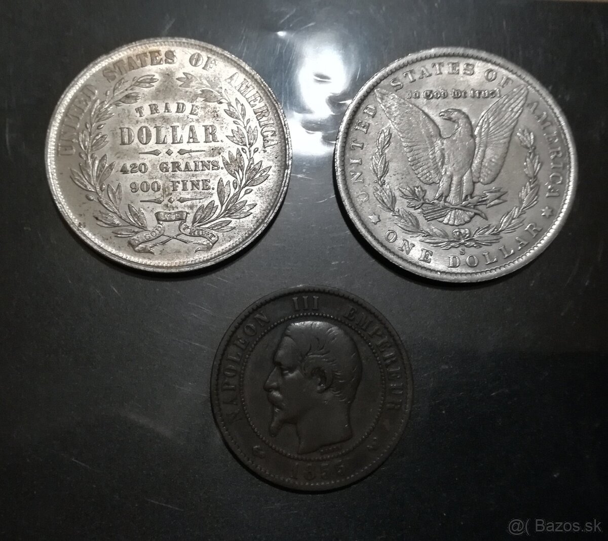 DOBRY VECER PRAJEM PONUKAM NA PREDAJ MINCE REPLIKY AMERICKY STRIEBORNY DOLLAR ONE DOLLAR-2EURO,TRADE DOLLAR-2EURO,A MINCU NAPOLEON3 BONAPARTE DIX CENT 1855-4EURO.K CENE TREBA PRIPOCITAT POSTOVNE.POSIELAM NA DOBIERKU POSTOU.