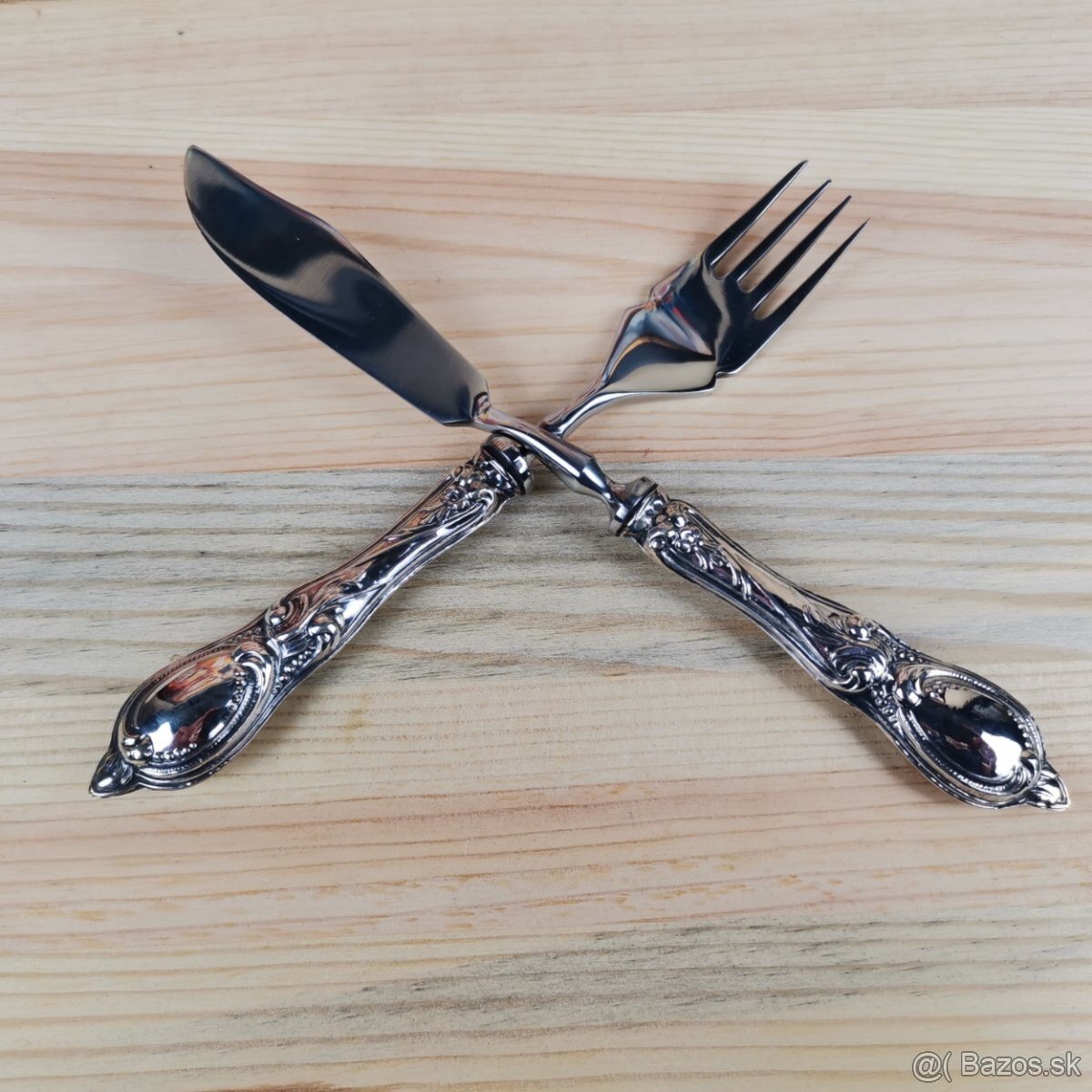 Strieborná rukoveť o rýdzosti 833/1000. Čepeľ noža ako aj ostatné časti, s ktorými sa konzumuje, sú z vysokokvalitnej ocele.
