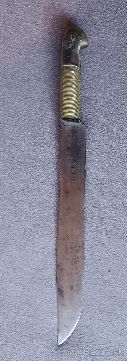 Veľká lovecká dyka/tesak z 19-teho storočia. Rukoväť rohovina omotana mosadznim drôtom.