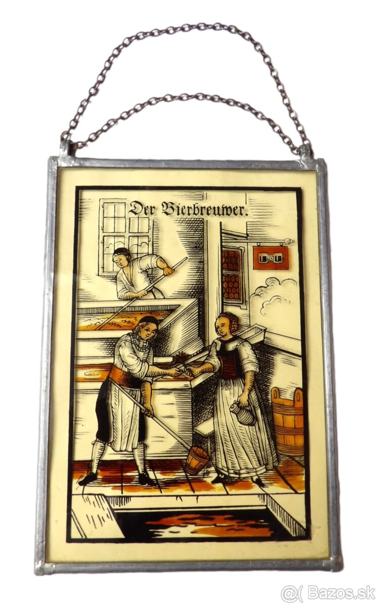 Stará vitráž s pivovarnickým motivem o rozměru 24,5 x 17,5 cm, kvalitní zabalení je samozřejmostí, dobírka Packeta 5,-€.