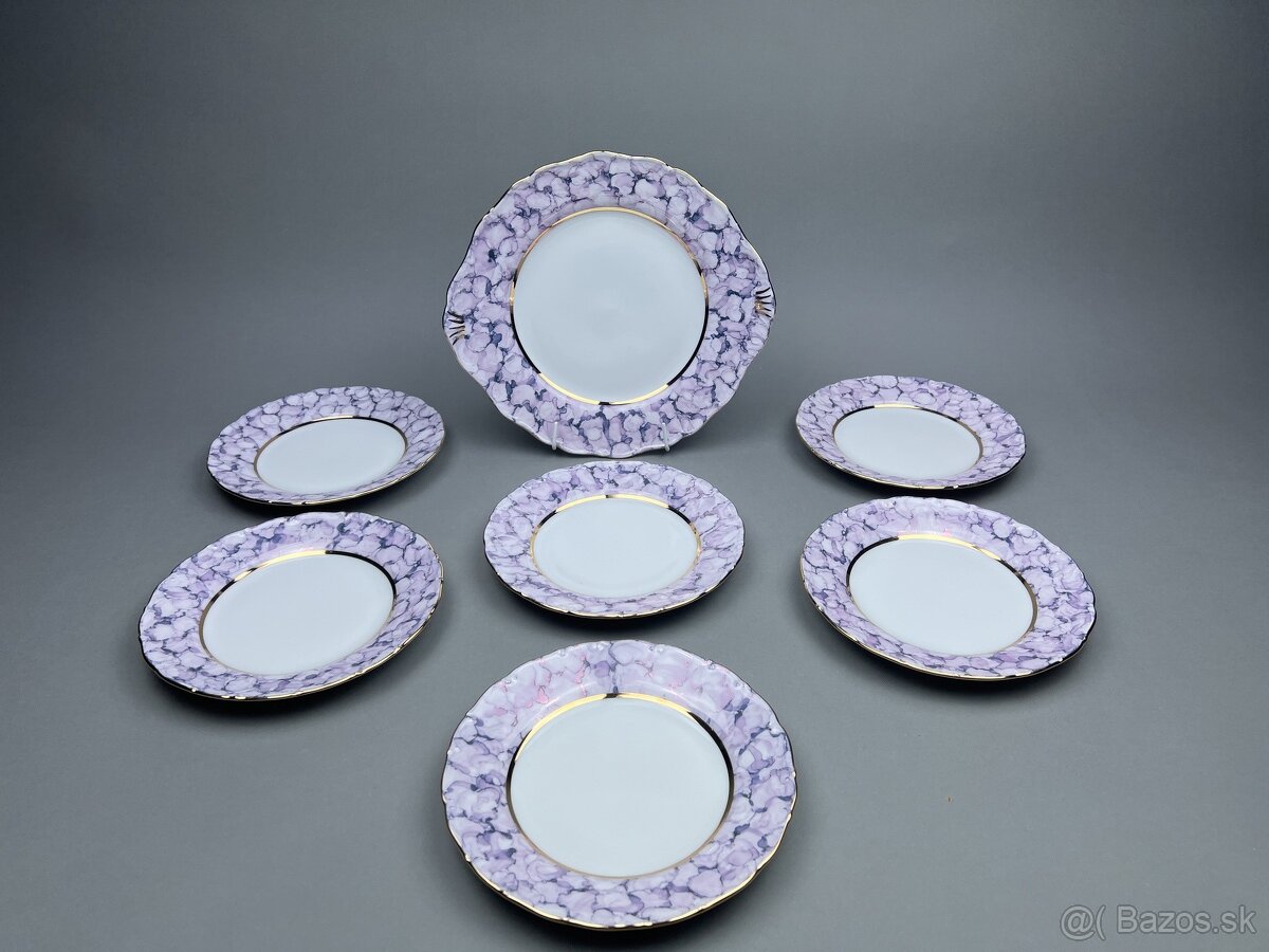 Predám novú koláčovú súpravu, ktorá nebola nikdy použitá, je bez poškodenia a zabalená v pôvodnej krabici. Je zdobená fialovým listrom a zlatým pásikom. Značená je- Malírna Plesná u chebu.