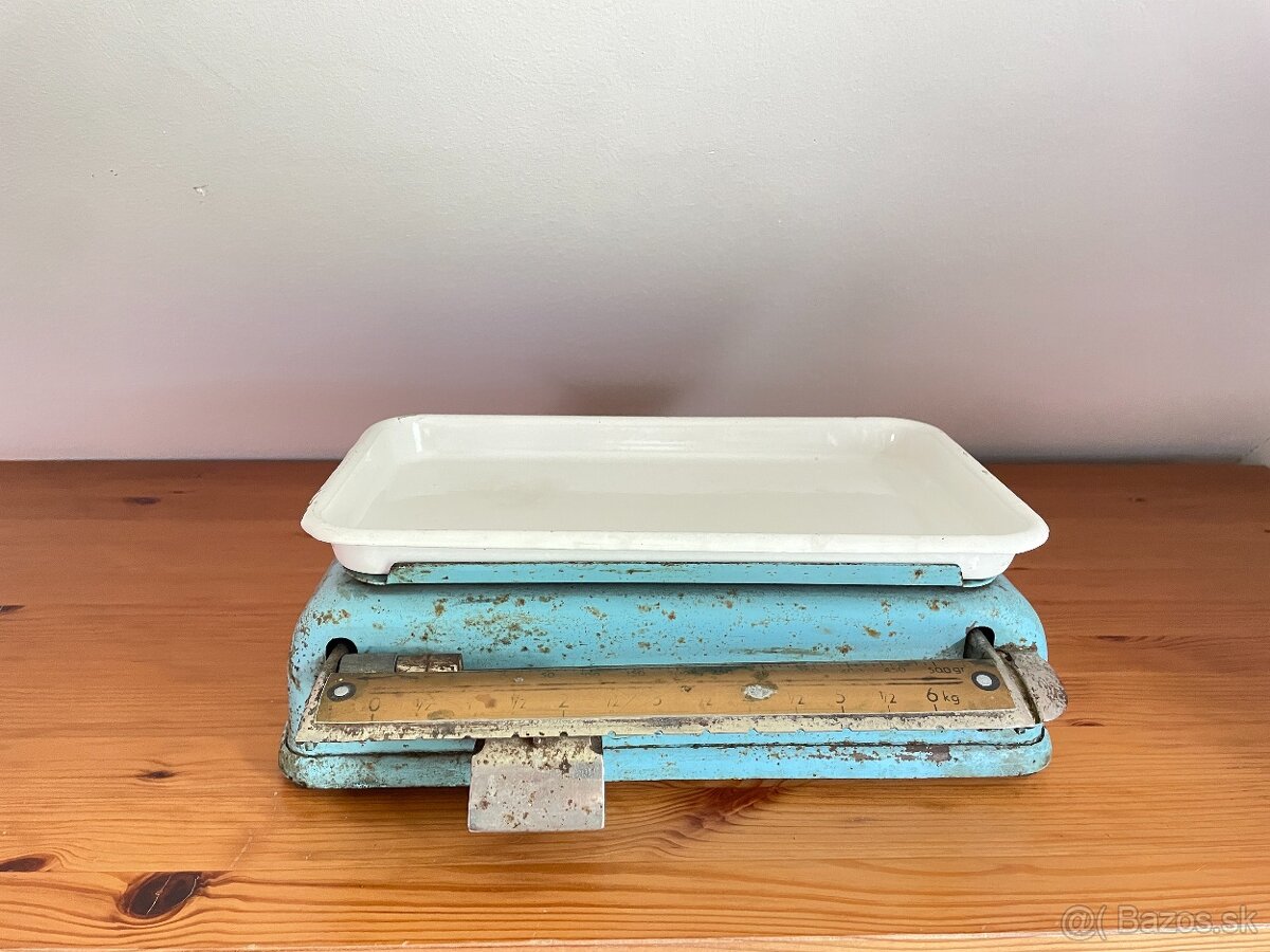 Starožitná váha. - [11.2. 2026]Predám starožitnú kuchynskú váhu aj so závažiami. Má poškodenú misku a chýba 1 závažie.