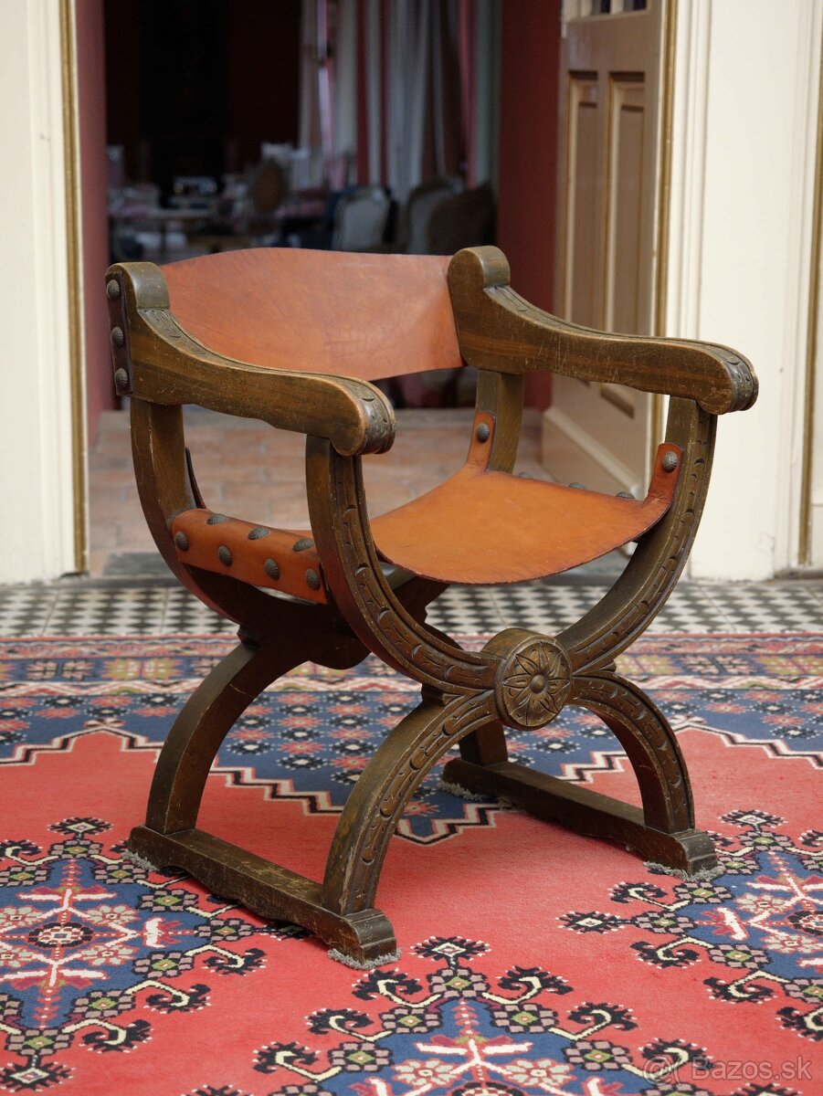 Starožitné kreslo Dagobert z masívneho duba s koženým sedákom a operadlom. Konštrukcia vychádza z historického stredovekého typu trónneho kresla s charakteristickou krížovou základňou. Masívne dubové časti sú ručne vyrezávané s dekoratívnymi ornamentmi a stredovým rozetovým motívom. Sedák a operadlo sú z pevnej prírodnej kože, upevnené ozdobnými kovovými klincami.