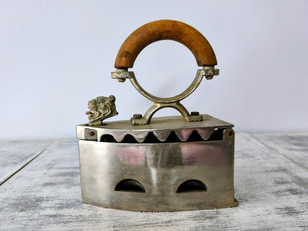 Starožitná žehlička v dobrom stave so známkami patiny.