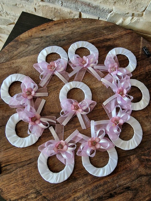 Venčeky sú vyrobené zo saténových stuhy a celokovového špendlíka.