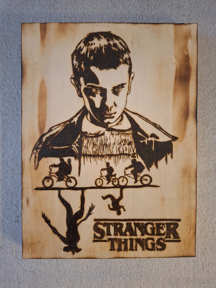 Ručne vypaľovaný obraz (pyrografia) na drevenej dýhe s motívom Stranger Things. Rozmer 24x18 cm. Jedinečný kúsok pre fanúšikov seriálu, žiadna strojová výroba. Skvelý doplnok do izby alebo ako originálny darček.
