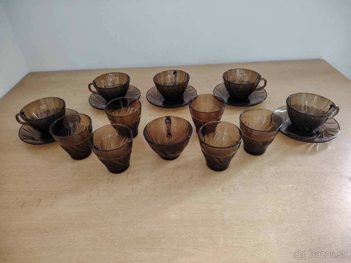 Kávová súprava+ poháre na vodu - [3.2. 2026]Kávová súprava + poháre na vodu, hnedé dymové sklo, nepoužívané, len skladované