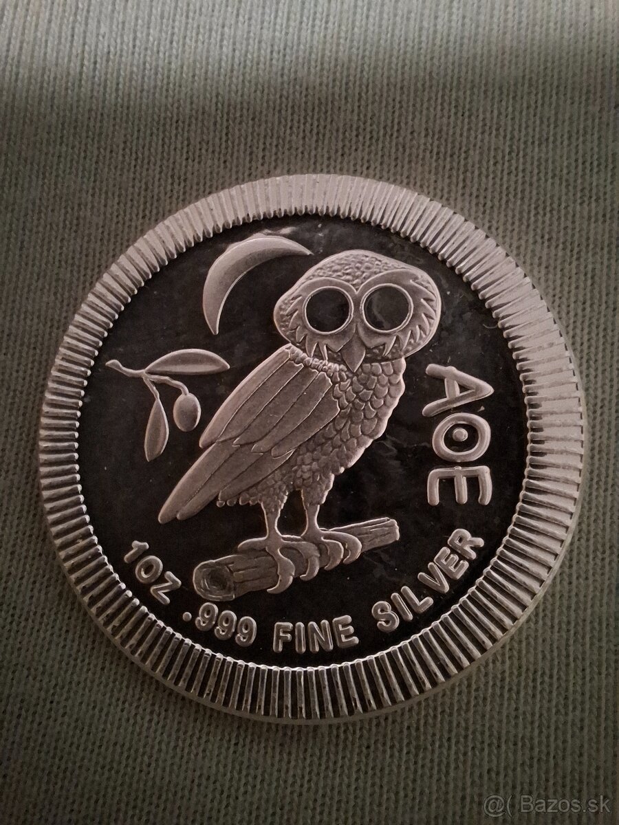Rub: Athénská sova na větvi s měsícem, olivovou ratolesťou, „AOE“ a „1 OZ .999 FINE SILVER“.