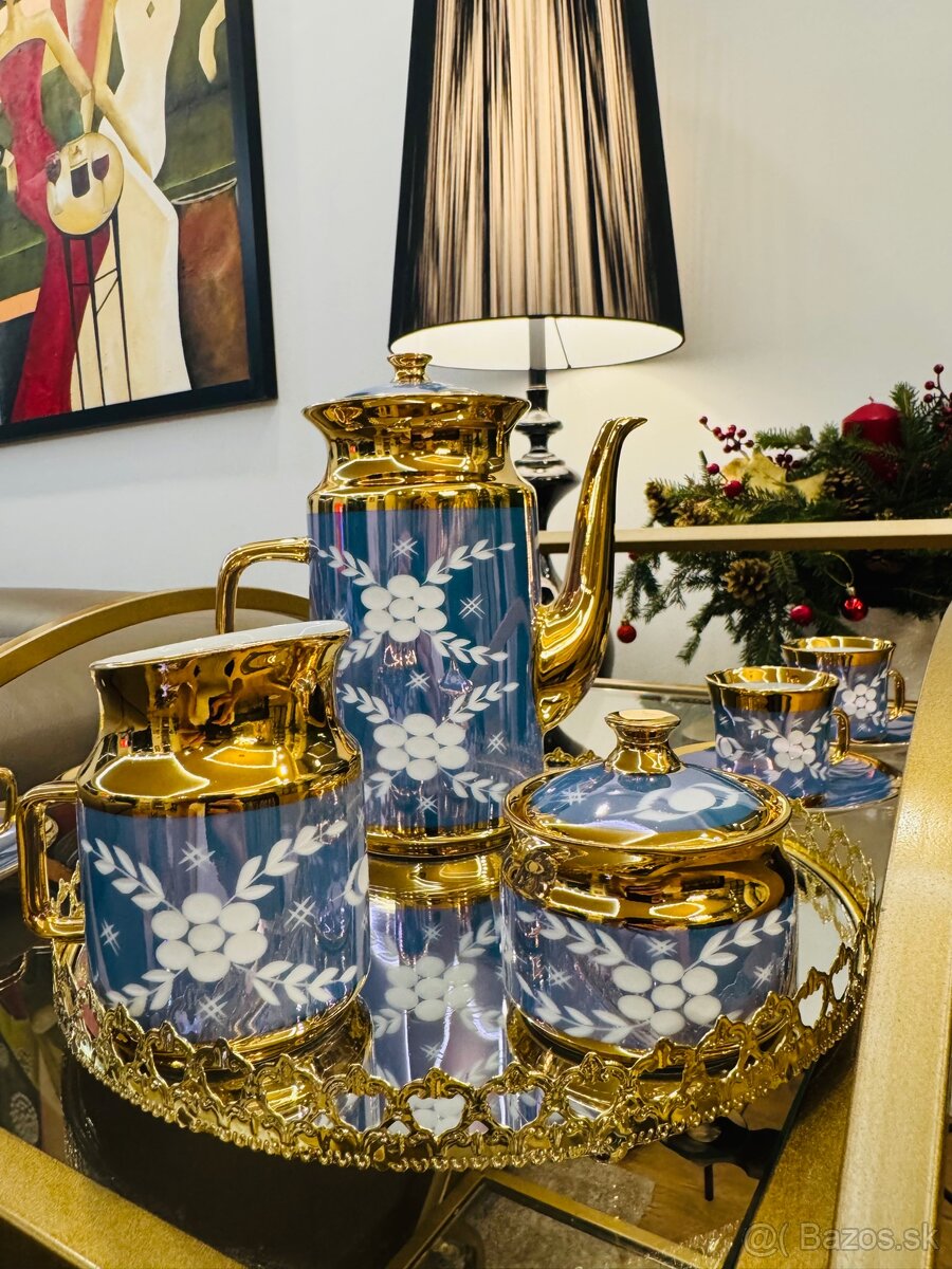 Originálny modro-zlatý ručne brúsený dekor, pravý porcelán. Stav vitrínový, nepoužívané.
