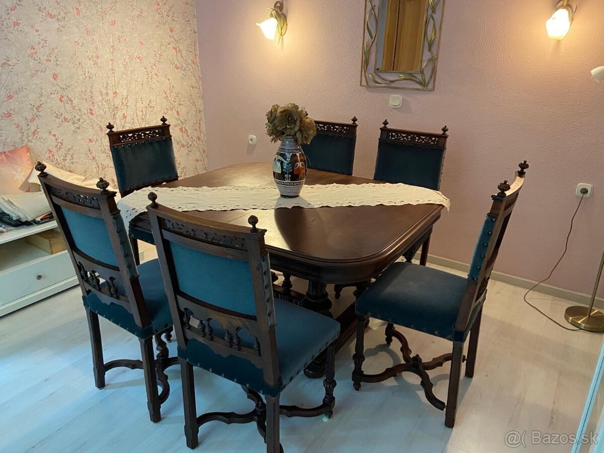 Predám jedálenský stôl so stoličkami. Dovezené priamo z Holandska. Vek určite viac ako 60 rokov.