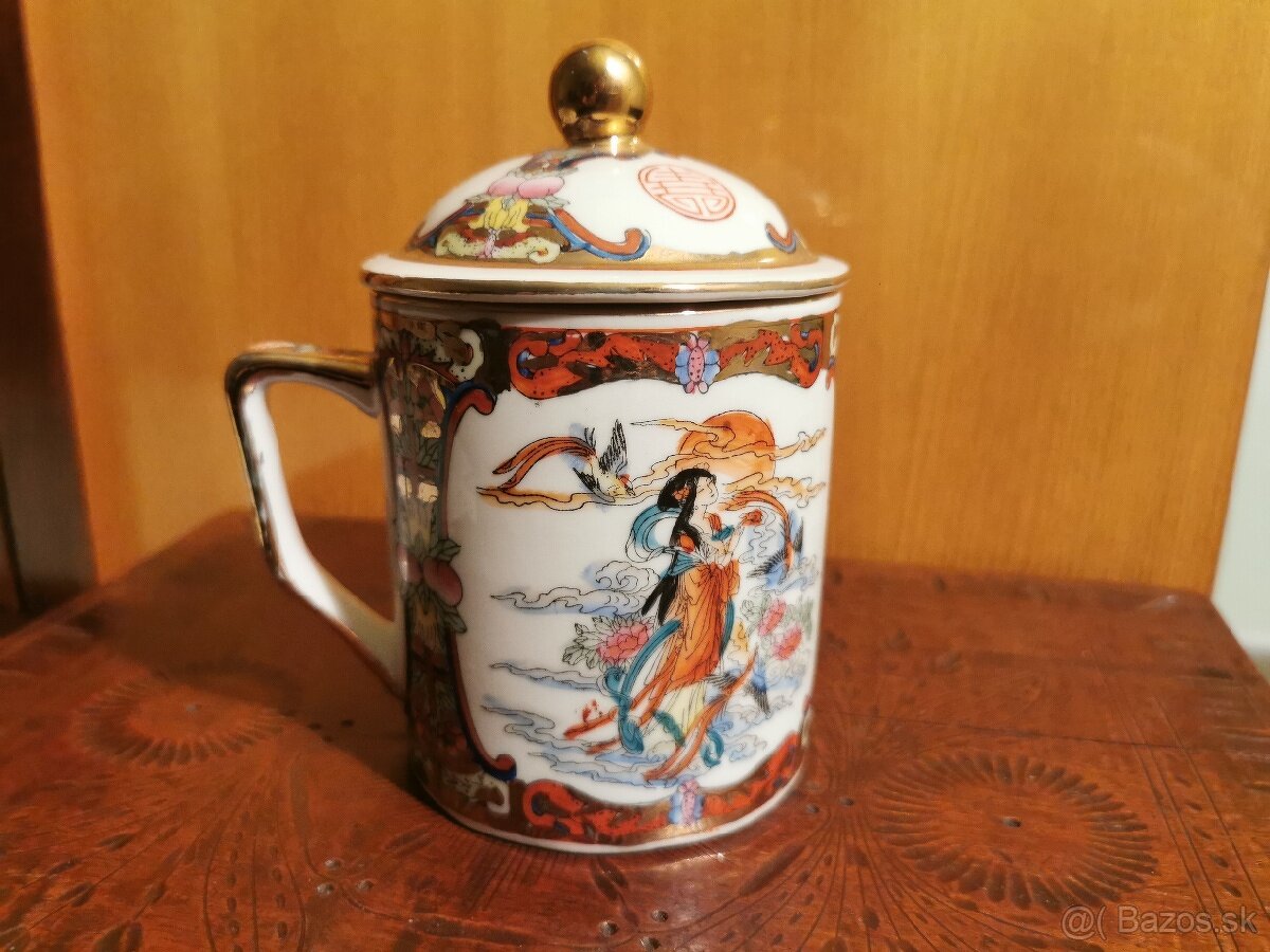 Nádoba zdobená orientálny symbolmi, môže slúžiť ako ozdoba alebo na pitie ci ako cukornička. Vysoka 9,7cm. V případě záujmu pište na mail alebo sms.
