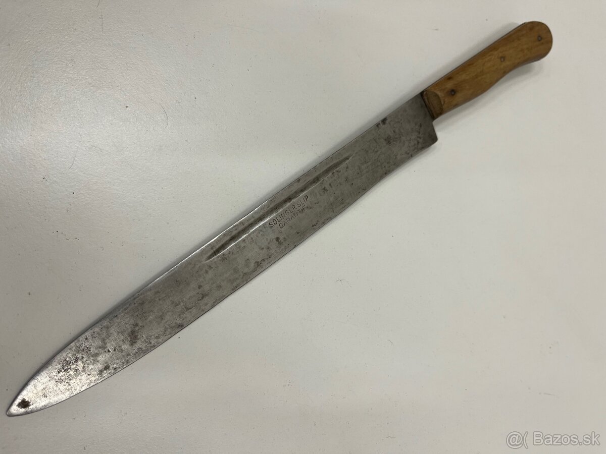 Obrovský starožitný kuchynský nôž - [16.3. 2026]Predám krasny masívny kuchynsky nôž 100ročný ..”Kus nábytku ! “ ….41cm dlžka…drevená rúčka pekná zdravá treba naolejovať a podstivú uhlíkovú čepel (3mmhrubú)prebrúsiť očistiť a používať dalej