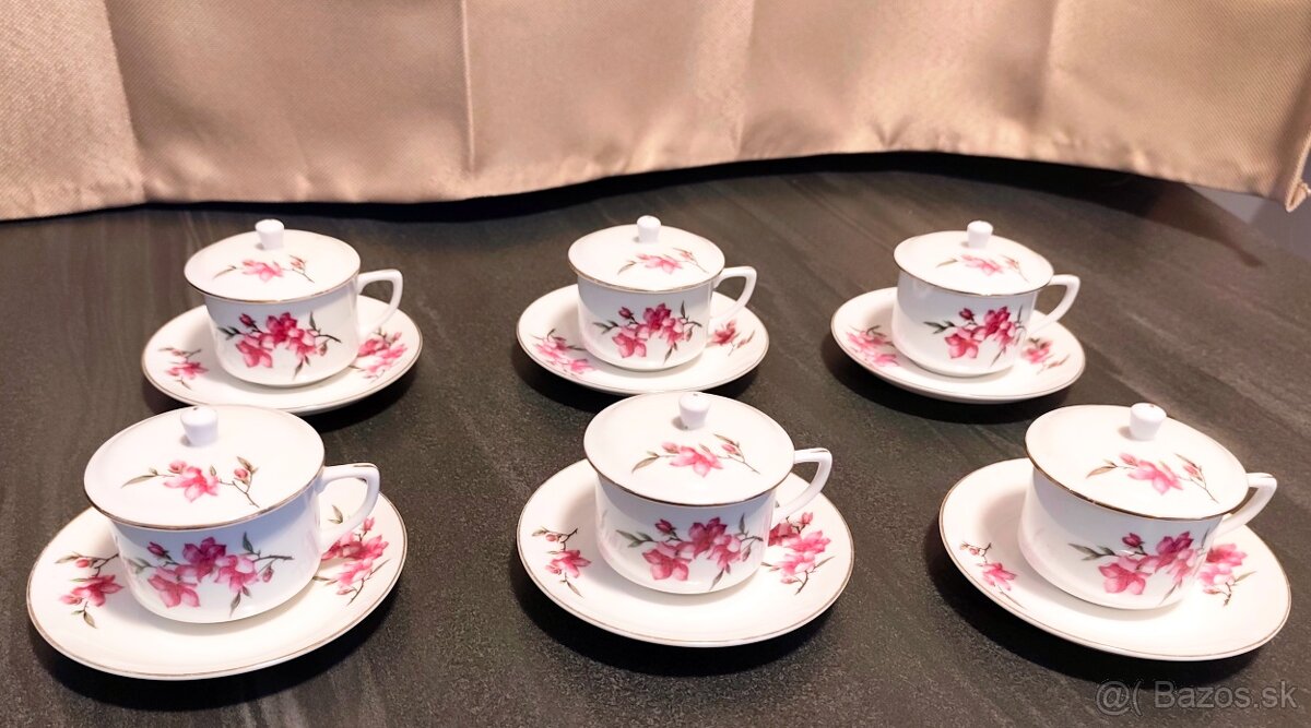 Súprava vintage čínskych porcelánových šálok s viečkami a podšálkami s ružovým kvetinovým motívom. Je to čínsky porcelán (China). Približne 50. až 80 roky.