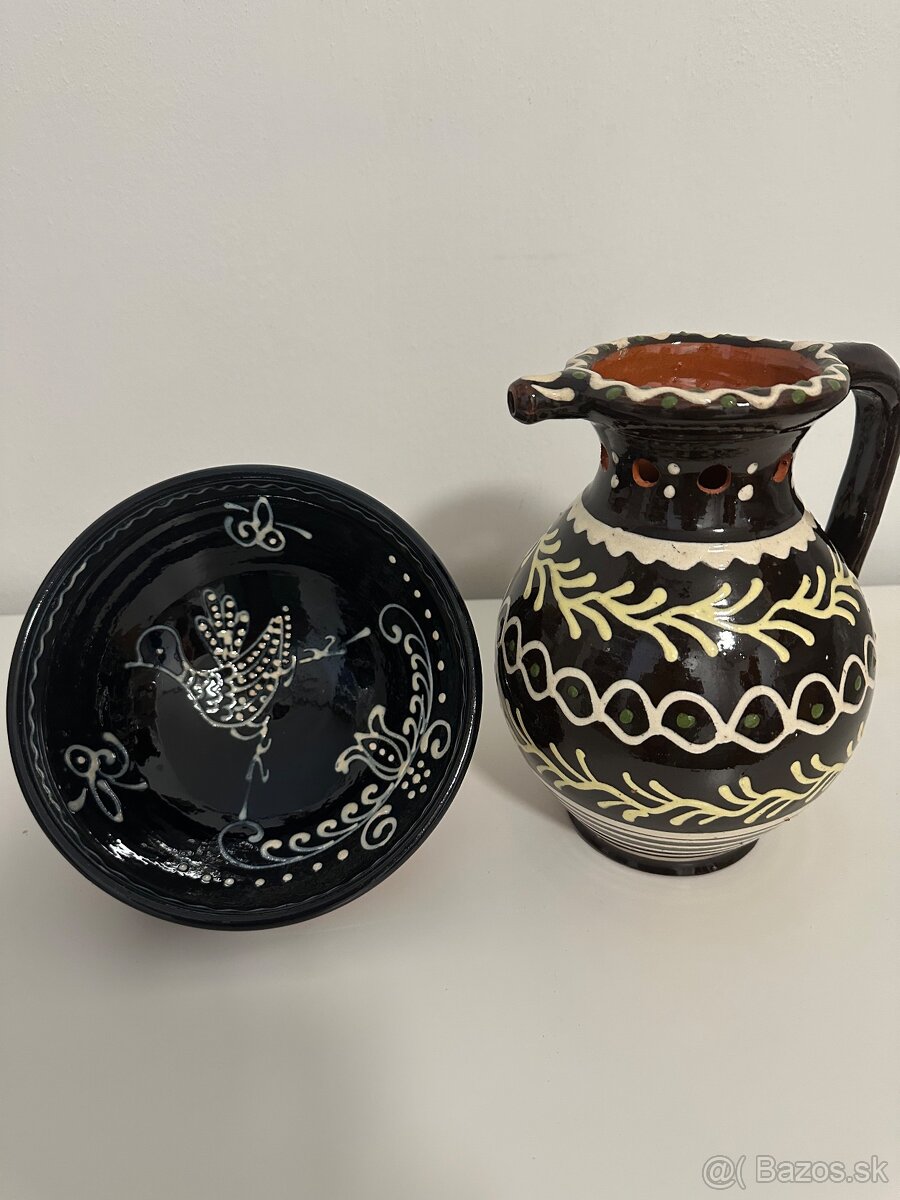 Predám ručne maľovaný džbán, vysoký 22 cm a misu s priemerom 19 cm a výškou 9 cm. Misa sa dá aj zavesiť, džbán má otvory v hrdle. Každý kus po 10€.