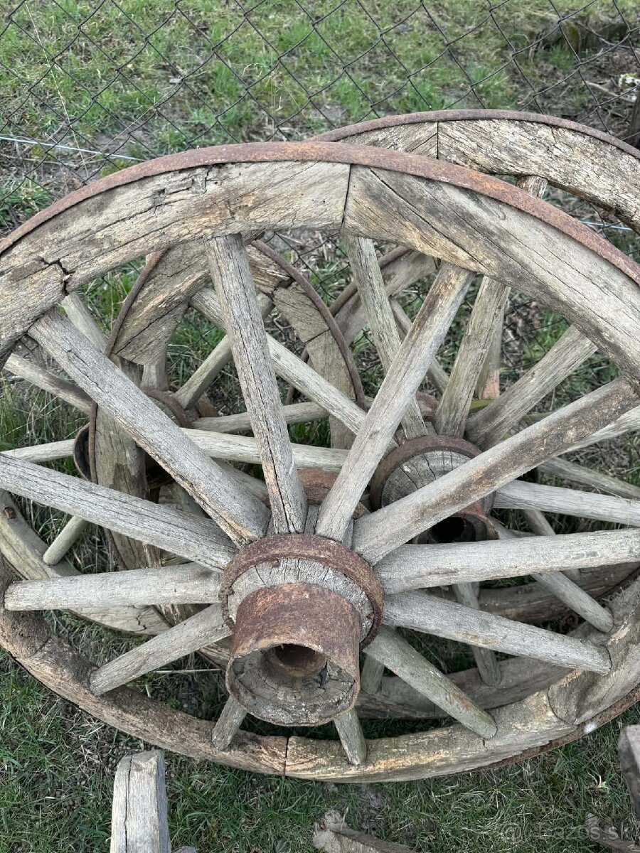 staré drevené kolesá z voza, kolesá sú vyrobené z dreva, s kovovými prvkami ako je stredový náboj a obruč