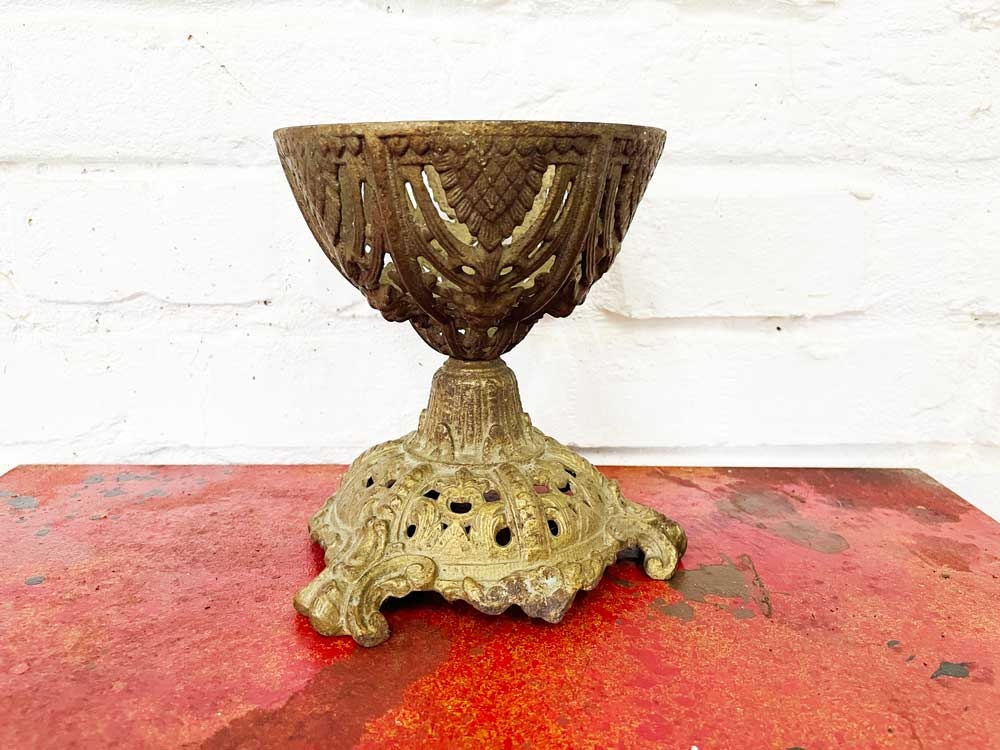 Bohato zdobený stojan petrolejovej lampy. Štylovo zodpovedá historicizmu až secesii (cca koniec 19. – začiatok 20. storočia). 17x16 .Liatina alebo bronzovaná zliatina. Tovar posielam poštou cez Packetu. Možné je aj osobné prevzatie v Senci. Dobierka nie. Pozri moje ďalšie inzeráty .