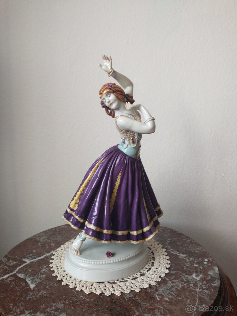 Predám Nádhernú veľkú porcelánovu tanečnicu v Art Deco štýle značená číslami vyrobená porcelánovou manufaktúrov Schierholz navrhnutá modelérom Gustavom Gossenbergom výška 34 CM tanečnica má prekrásne farby a zlatenie vysoká postava má nádherne zachytený pohyb tela má na sebe množstvo krásnych detailov šperky a gorálky prekrásny starožitný vzhľad možnosť osobnej prehliadky, osobný odber alebo poštou zaručujem precízne balenie kuk všetky moje inzeráty ďakujem