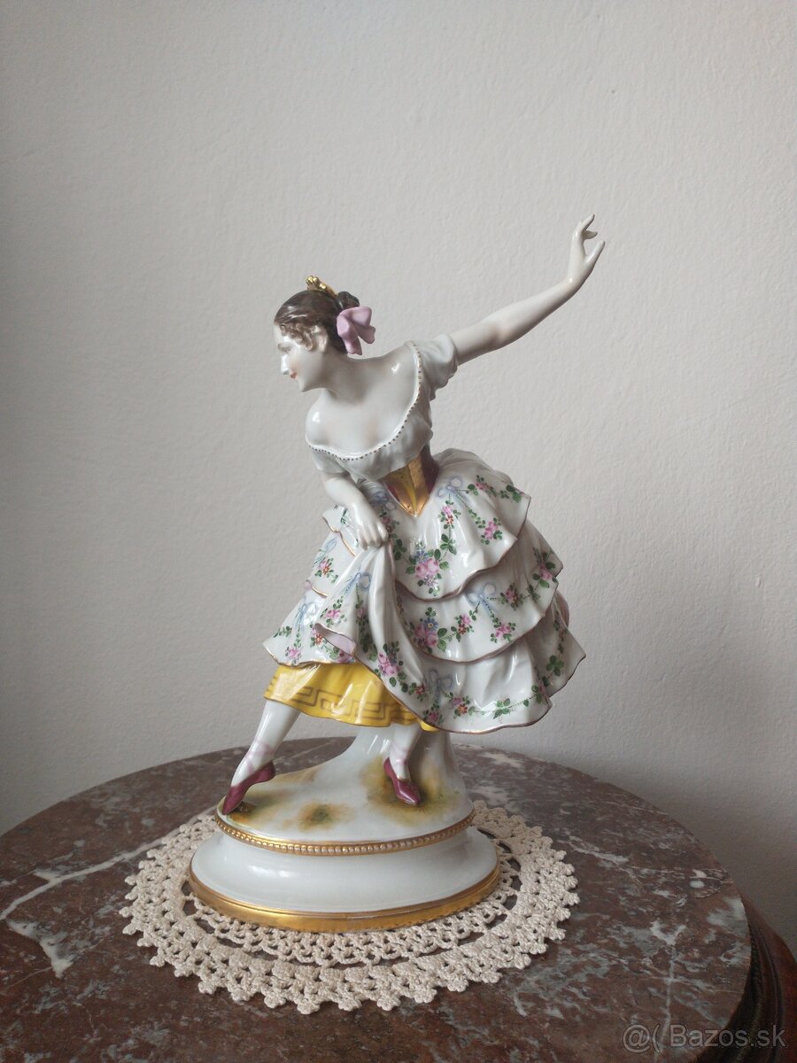 Predám krásnu baletku značená Volkstedt Rudolstadt Marie Guy Stephan vo Volkstedte sa predáva pod názvom Fanny Eissler výška 30 CM krásne detaily tváre a zachytený pohyb tela zlatená korunka podstavec a okraje sukne všetko ručne maľované táto soška sa vyrába v rôznych veľkostiach ponúkam najväčšiu z nich možnosť osobnej prehliadky, osobný odber alebo poštou zaručujem precízne balenie kuk všetky moje inzeráty ďakujem