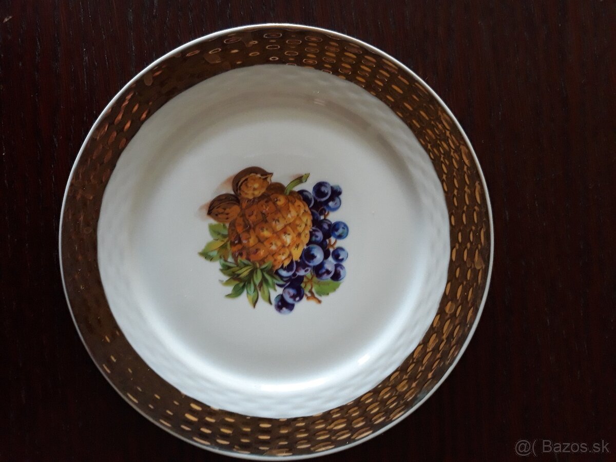Predám 5 ks porcelánových dezertných tanierov s ovocným motívom, pozláteným okrajom československej výroby z r. 1962. Zberateľské kúsky.