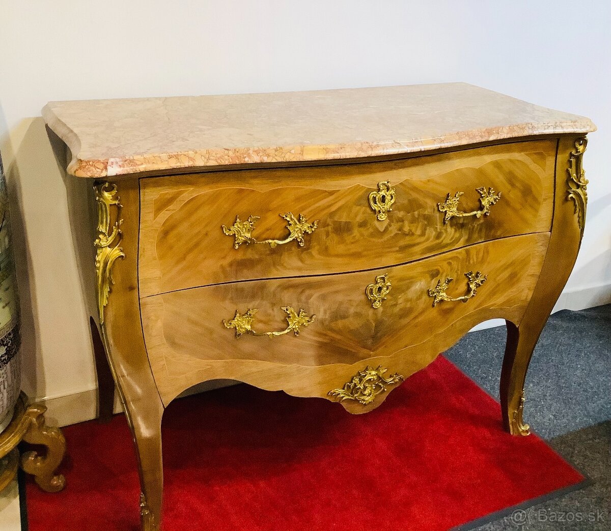 starožitná komoda s mramorom Francúzsko zdobená bronzom - [15.3. 2026]starožitná komoda s mramorom výroba Francúzsko, zdobená bronzom a vyrezávanou drevenou intarziou s mohutnými bronzovými rokokovými reliéfmi, hore je položený krásny biely vyrezávaný mramor s prírodnými žilkami, s komoda aj mramor sú bez poškodenia, originál stav, vek cca 200 rokov. Jemná ručná prác ...