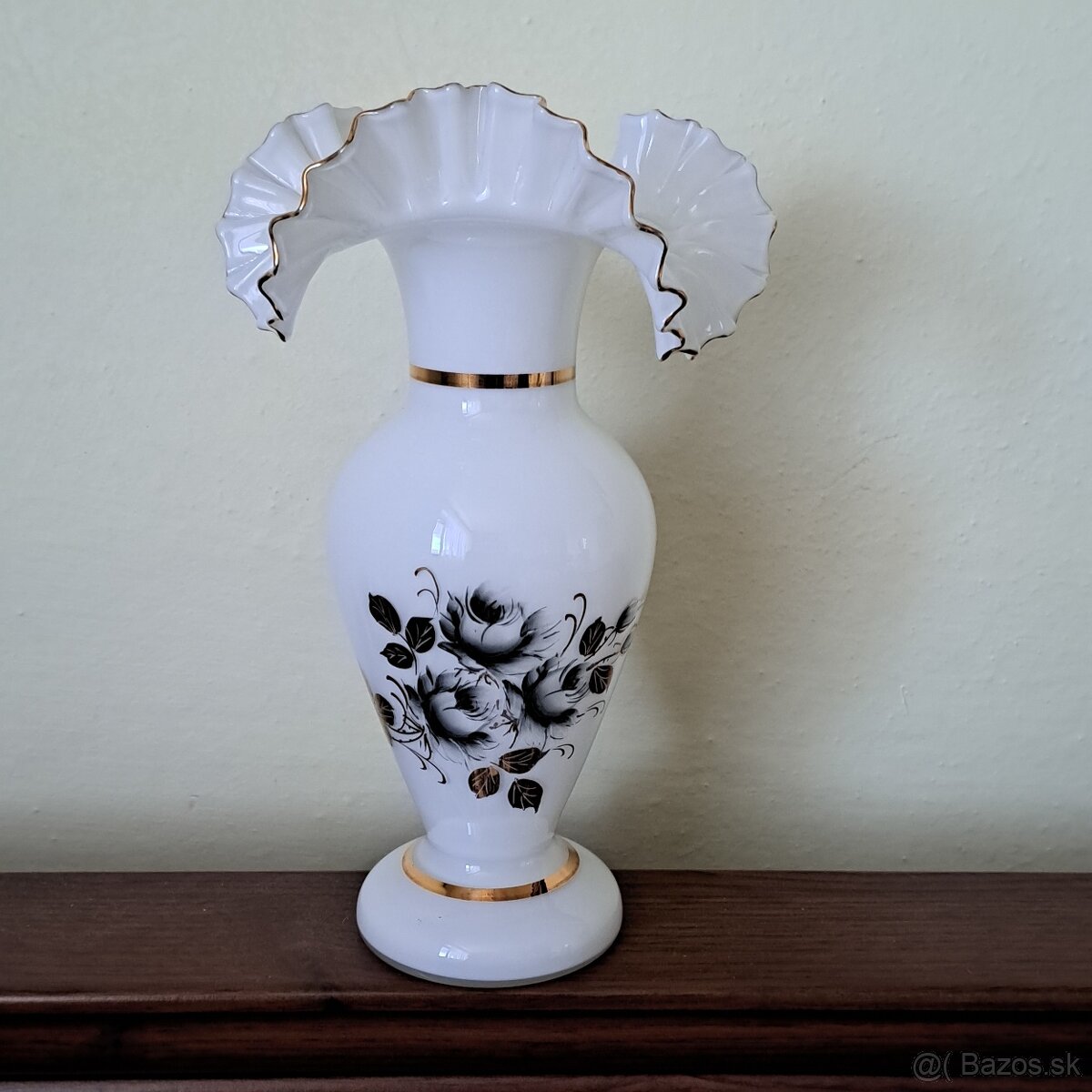V ponuke táto krásna dizajnová váza z mliečneho skla,s vlneným okrajom,obdobie 50,-60.roky,ručme maľované kvety a zlaté zdobenie,výška 25 cm,bez poškodenia, prasklín a oťukov, cena 33 eur+poštovné