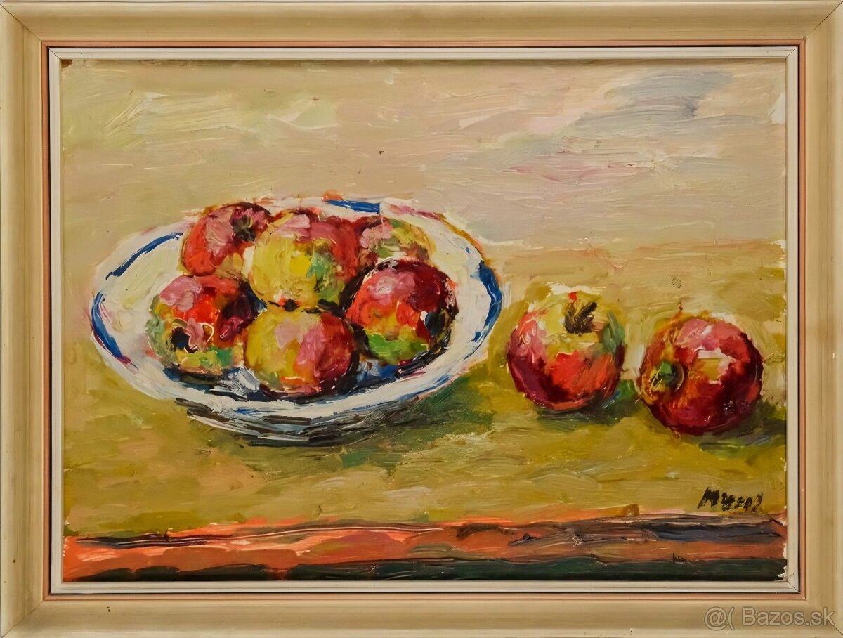 Pôsobivá olejomaľba od uznávaného maliara Vysočiny, Leopolda Musila. Dielo zobrazuje klasický motív jabĺk v miske, pričom autor využíva svoj typický pastózny rukopis (hrubšie nánosy farieb), ktorý dodáva obrazu plasticitu a energiu.