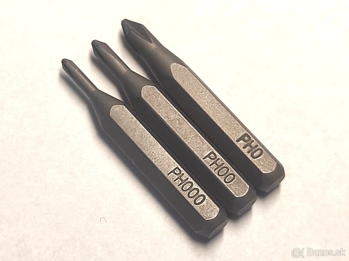 Predám nové krížové skrutkovacie bity v troch veľkostiach – PH0, PH00, PH000, s násadou H4 (hex) a celkovou dĺžkou 28 mm.