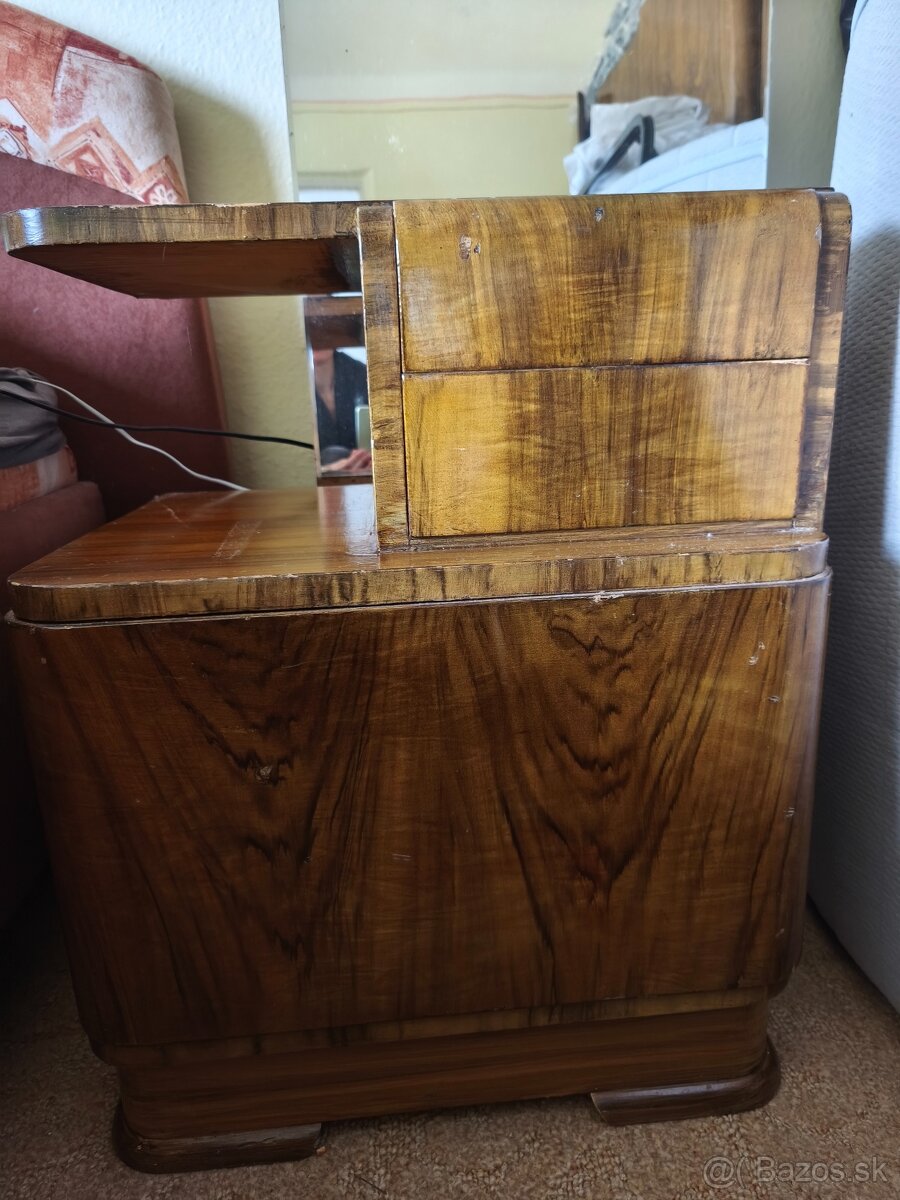 Predám 2 ks retro drevené nočné stolíky s dvoma suplikmi a jednou skrinkou, 1 ks za 30€ + 1 zrkadlo k tomu zadarmo.