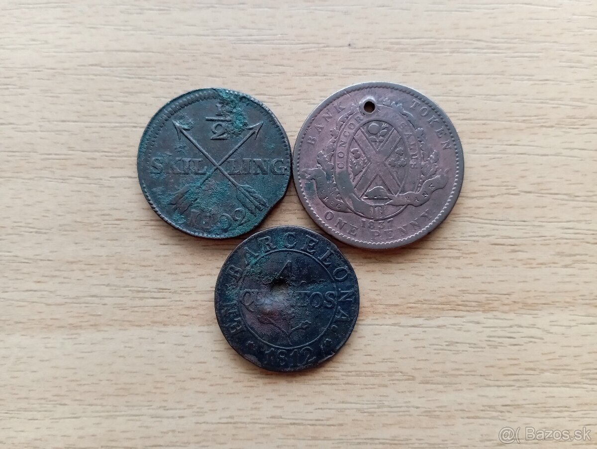 Predám Švédsko 1/2 Ore 1802, Kanada 1 Penny 1837, Španielsko 4 Quartos 1812 za 8 Eur/kus