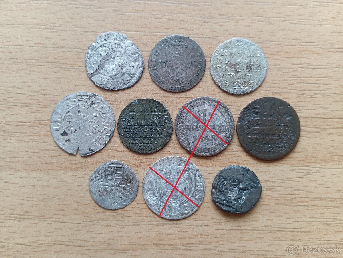 Švédsko 1 öre Christina 1632-1654 za 6 Eur, Dánsko 2 Skilling 1775 za 8 Eur, Dánsko 2 Skilling 1803 za 7 Eur, Halberstadt 1 Körtling (½ Groschen) 15?? za 15 Eur, Meklenbursko-Schwerin 1 Šiling 1774 za 7 Eur, (Hannover 1 Groschen 1858 predané), Hesensko-Kasselsko 1 halier 1723 za 3 Eura, 2 Pfennig 164? Salzburg za 6 Eur, (Polsko Poltorák 16Z6 predané), Vijayasena 238-250 Drachma (Western Kshatrapas 35-405) za 10 Eur