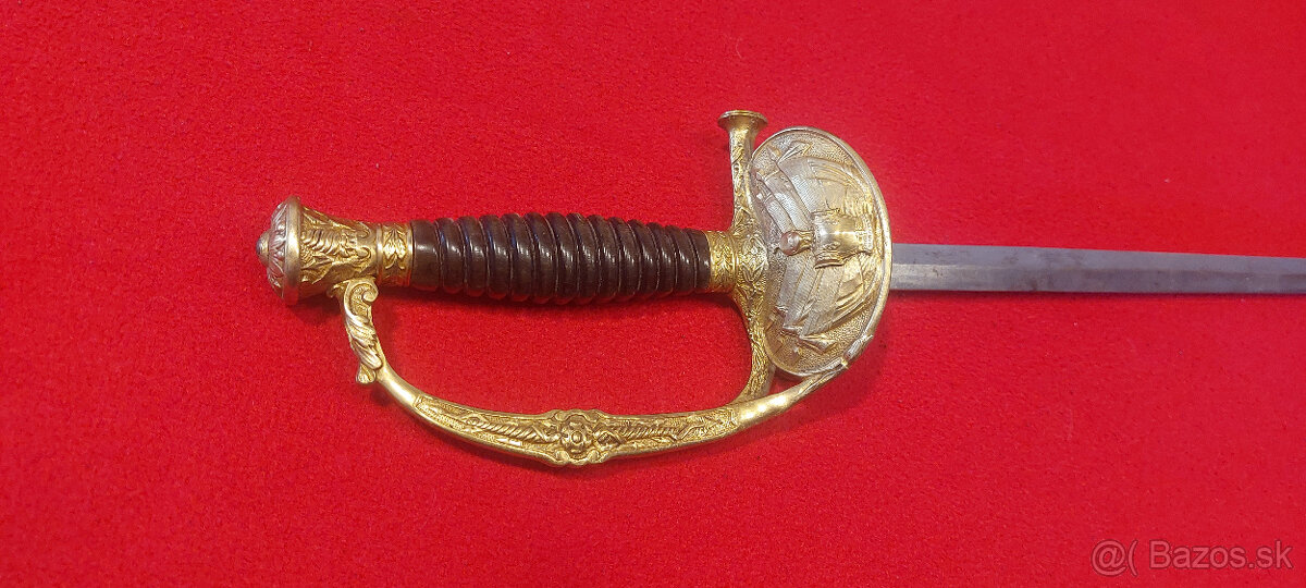 Mosadzný držiak, jednoramenný chránič a záštita s kyrysom na zväzku vlajky. Čepeľ so stredovým hrebeňom. Dĺžka 97 cm.