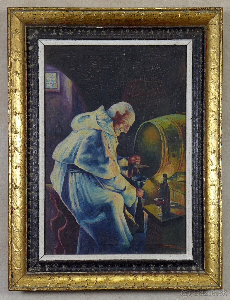 Predám olejomaľbu....natočenie vína mníchom o rozmeroch 36 x 48 cm.