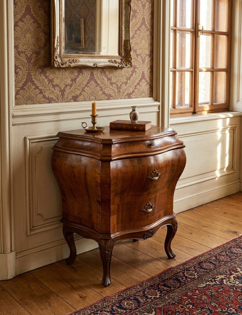 Pekná drevená komoda so šuflíkmi.Prirodzená štruktúra dreva a vosková povrchová úprava jej dodáva noblesu starožitnosti. Celá komoda je veľmi pekne netradične tvarovaná.