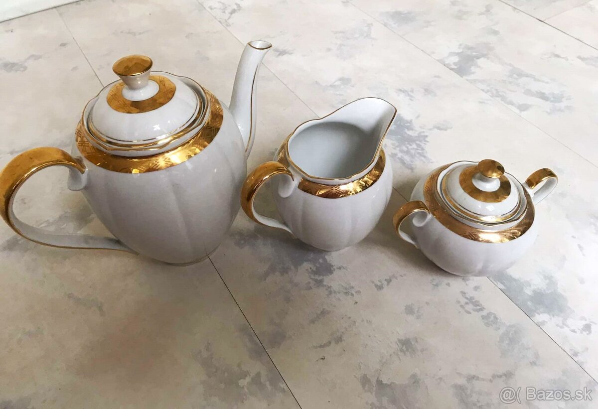 krásna starožitná súprava bez akéhokoľvek poškodenia,15 ks,jemný tenučký kvalitný porcelán s výrazným zlatením,top stav - bola iba vystavená, vyrobená v roku 1955